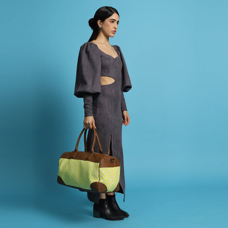 Our Electric Lime Duffle Bag is a stylish and versatile accessory crafted from high-quality jacquard fabric and vegan leather. It features an intricately woven pattern, often with a sophisticated design, and is spacious enough to hold various essentials. Typically equipped with durable handles and a detachable shoulder strap, this bag offers both practicality and fashion, making it a chic choice for travel or everyday use. The interior compartments provide organizational convenience, and its aesthetic design adds a touch of elegance to any outfit.