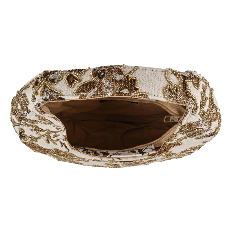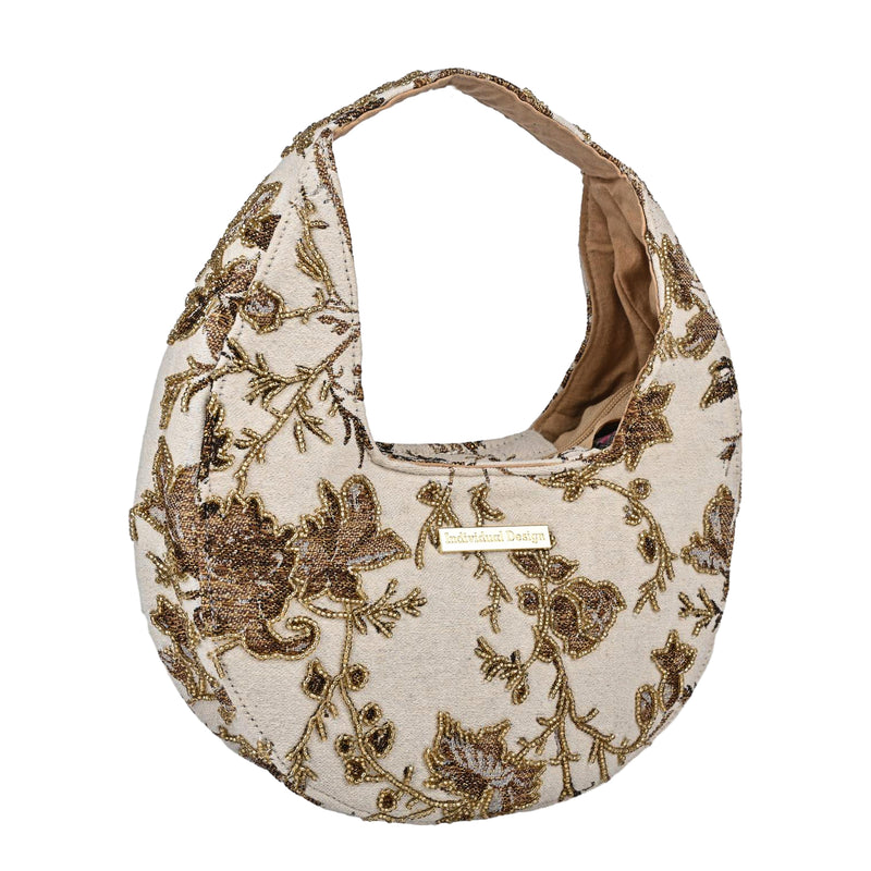 Add an elegant flair to your ensemble with this hand-embroidered crescent-shaped handbag. Featuring intricate golden and bronze floral beadwork on a plush ivory base, this eye-catching accessory is designed to elevate any special occasion look. Its soft yet structured silhouette brings a graceful charm, blending traditional craftsmanship with modern sophistication.